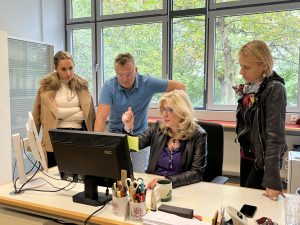 Na Danima otvorenih vrata susreli smo nastavnike i učenike iz OŠ Pavao Belas iz Brdovca, koji u suradnji s njemačkom gimnazijom sudjeluju u informatičkom izazovu kojeg financira njemački teleoperater, a riječ je o vještinama s mikrobitovima, mikročipovima i sl. Učenike su podijelili u mješovite timove i natjecali su se u programiranju. Tijekom našeg boravka, sudjelovao je tim iz Hrvatske, dok će u studenom Nijemci s istim razlogom posjetiti školu u Brdovcu. Njihov skori dolazak iskoristili smo da s ravnateljicom Majom dogovorimo susret u Zagrebu, da uzvratimo gostoprimstvo i organiziramo obilazak naše škole.